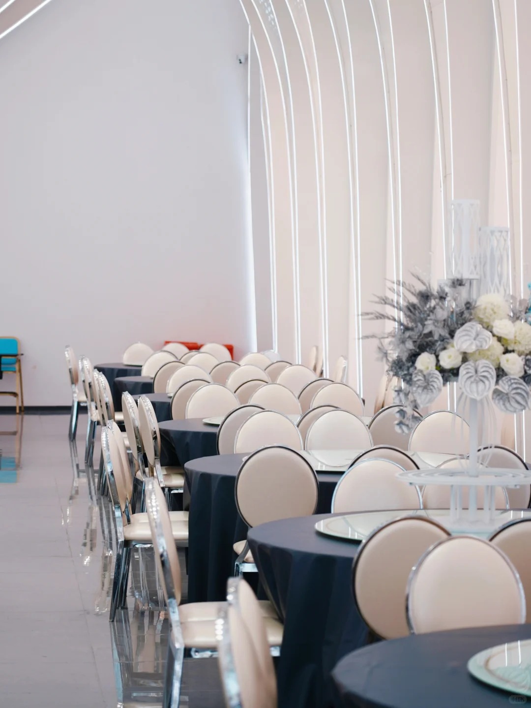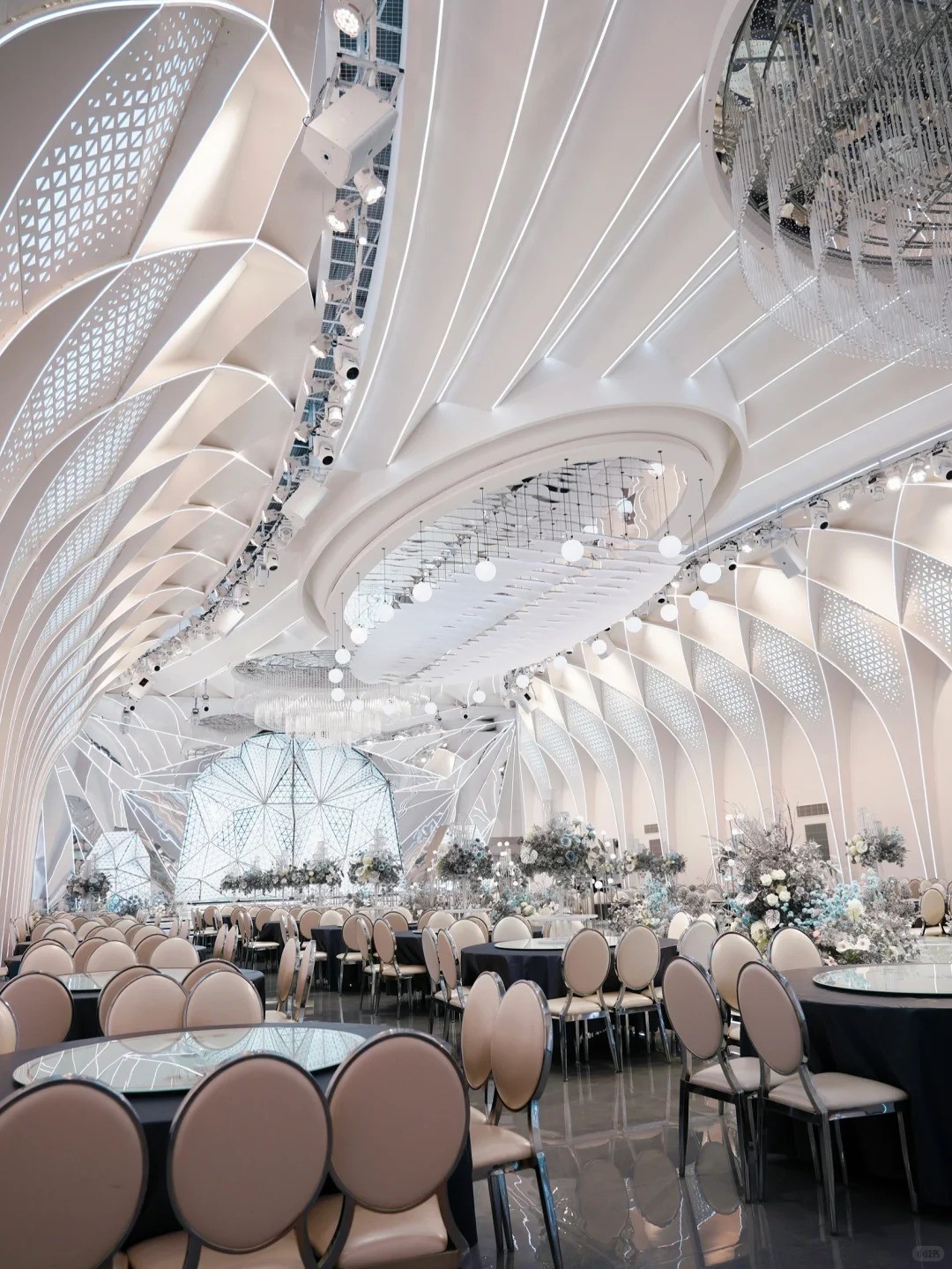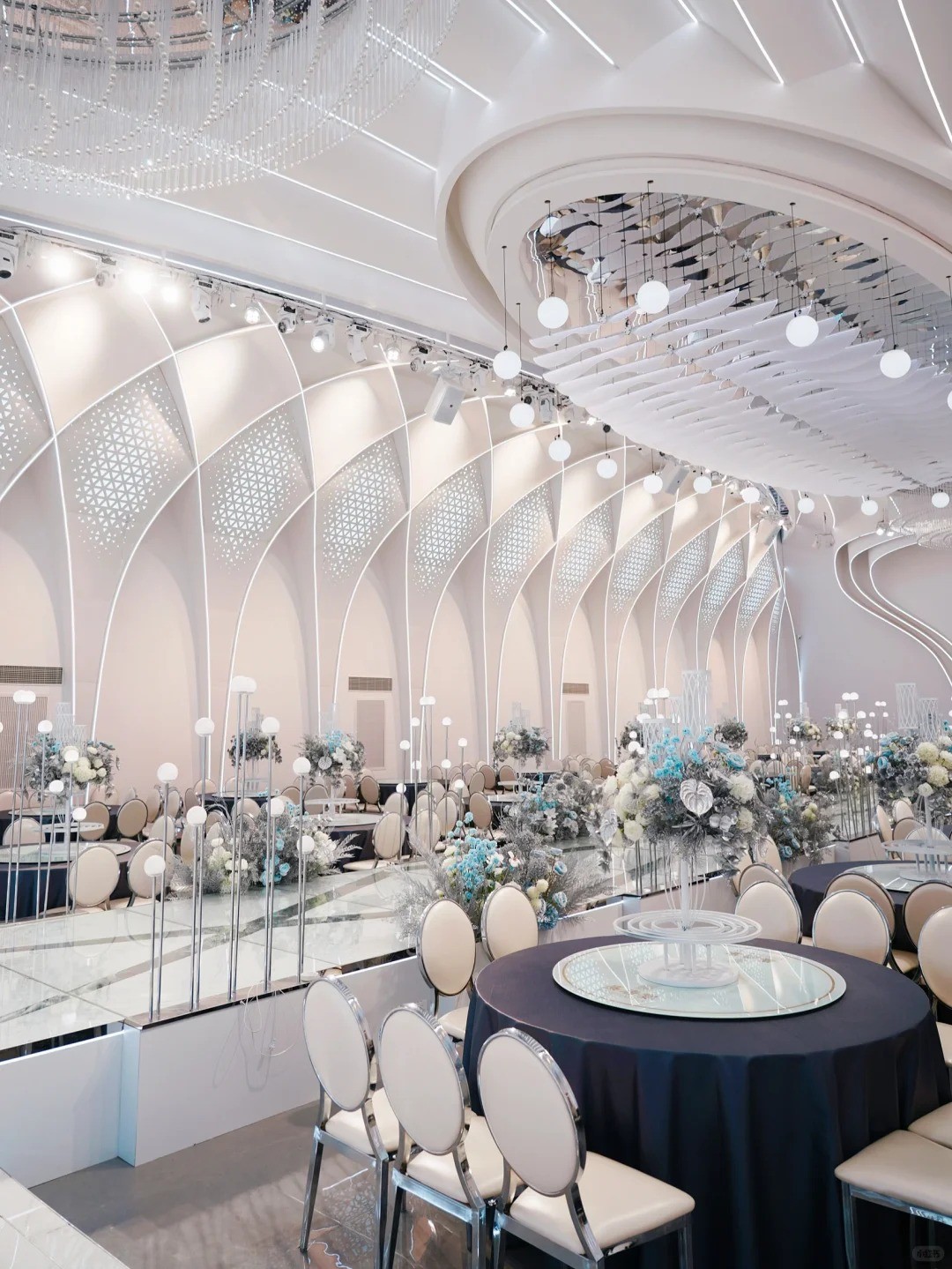 #西安婚宴酒店推荐 酒店位于灞桥区港务区,配有独立停车场 酒店共有五个主题厅和两个多功能厅 今天分享的这个钻石婚礼堂 桌数容纳20-33桌 宴会厅层高高,视野开阔无柱 性价比更是能打,1398起 仿佛是一座未来感的水晶宫殿,几何线条的墙面设计独特,奢华又充满科技感 还在备婚的西安姐妹们!真的可以冲!